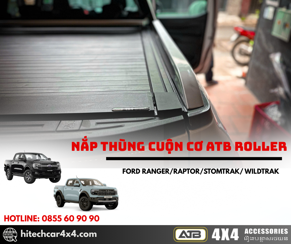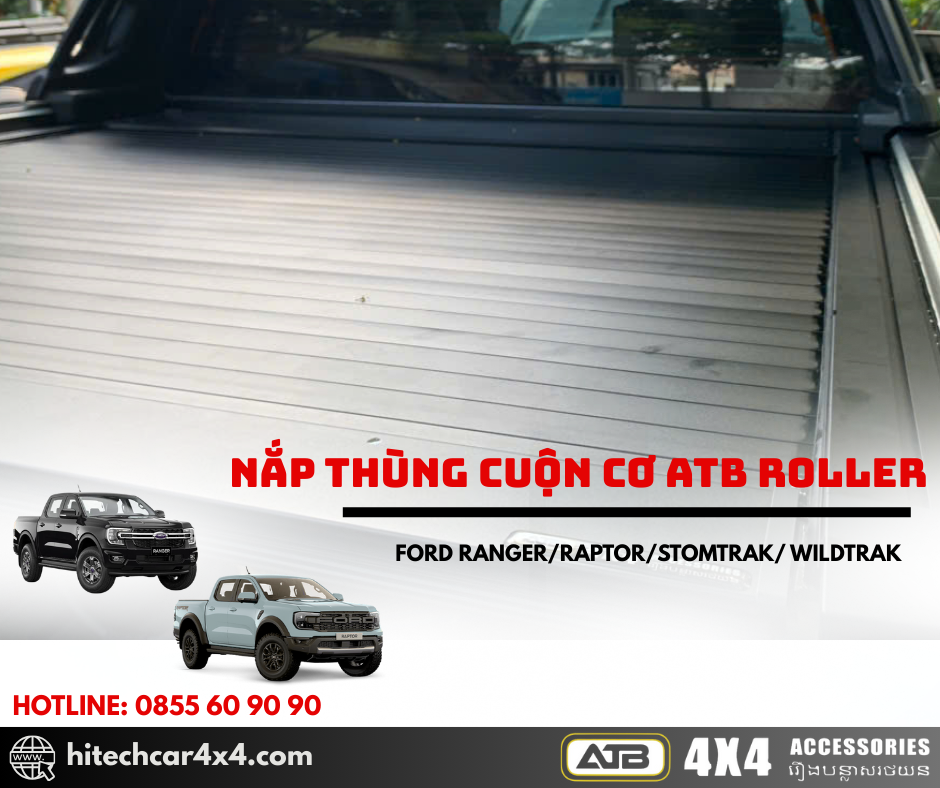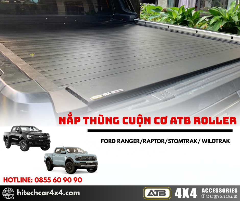 NẮP THÙNG CUỘN CƠ ATB ROLLER FORD RANGER 2022-2025 thiết kế cuộn nhẹ nhàng, không kêu khi đi qua địa hình xấu, thiết kế nhẹ từ nhôm sơn tĩnh điện, chống nước và bảo vệ hàng hóa tối ưu với hệ thống khóa an toàn và kết nối cao su chắc chắn.